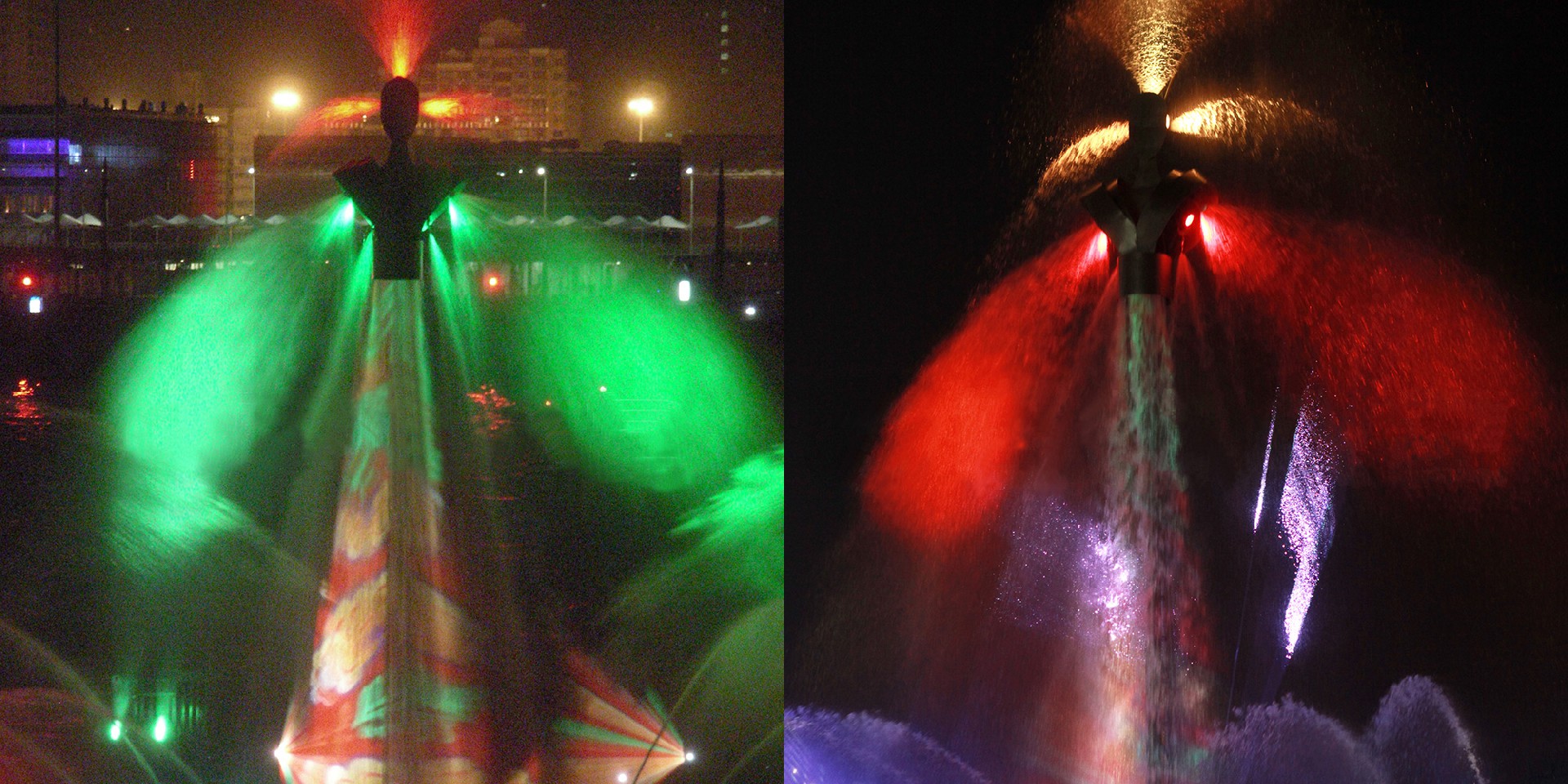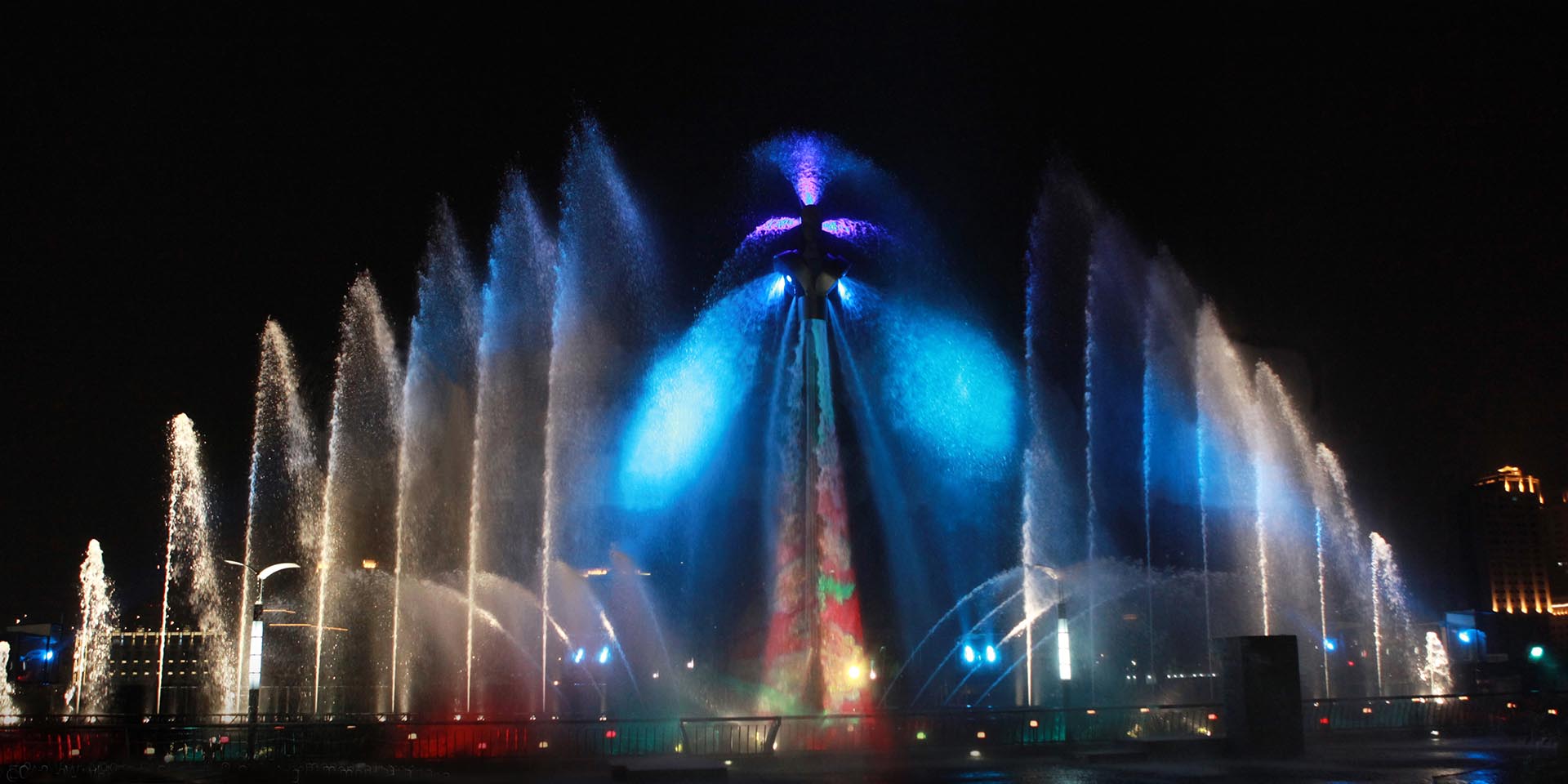 2010上海世博会开幕式喷泉表演由四座搭载喷泉、灯光、激光、焰火、喷火、影像的可移动式水秀表演装置组成,运用绚丽灯光、奇妙装置、流动喷泉、灿烂焰火以及多媒体等综合元素,构成“五洲同欢庆、四海齐欢腾”的盛大庆典。
