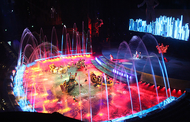 汉秀剧场是一个从空中、水池及地面全方位地展现剧目的水秀剧场,其中的水池深10米,面积900多平方米,全场的演出以与水相关的表演贯穿始终,是目前国内最大的室内演艺秀场。