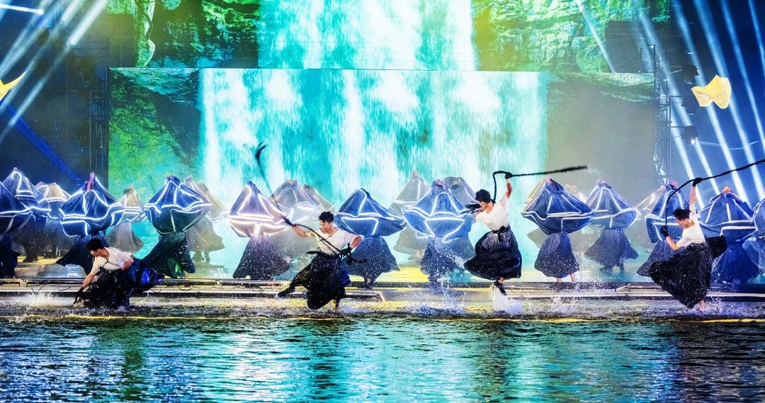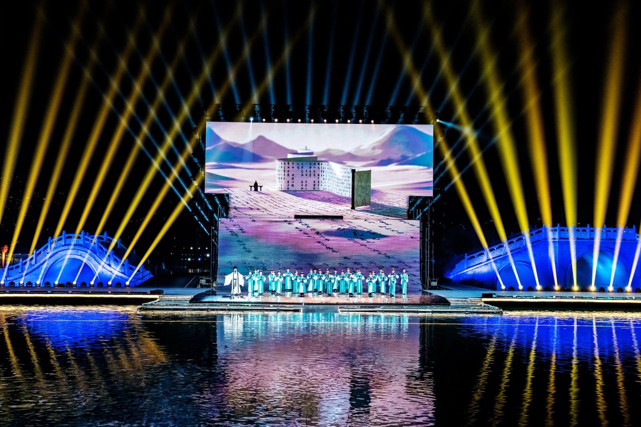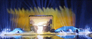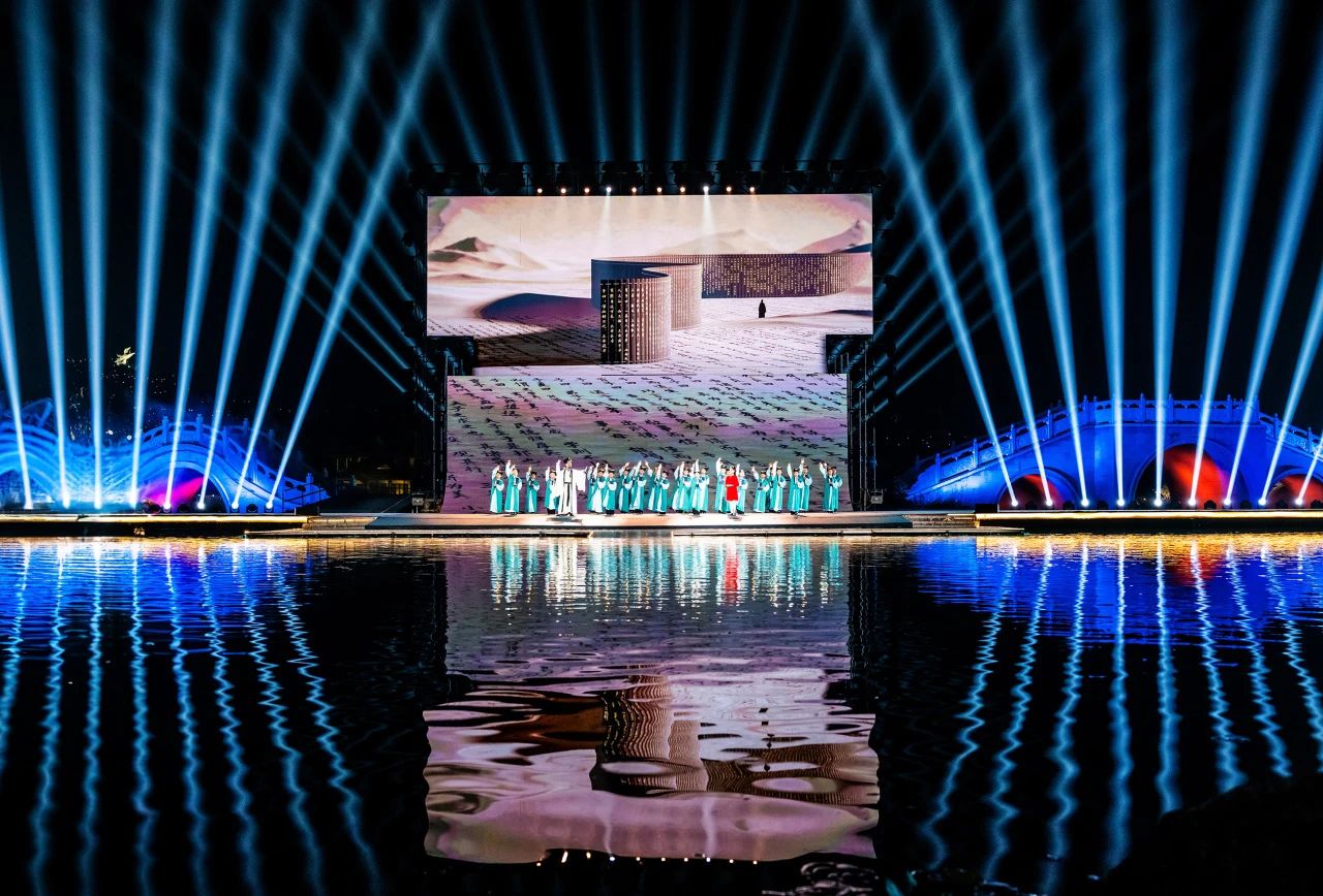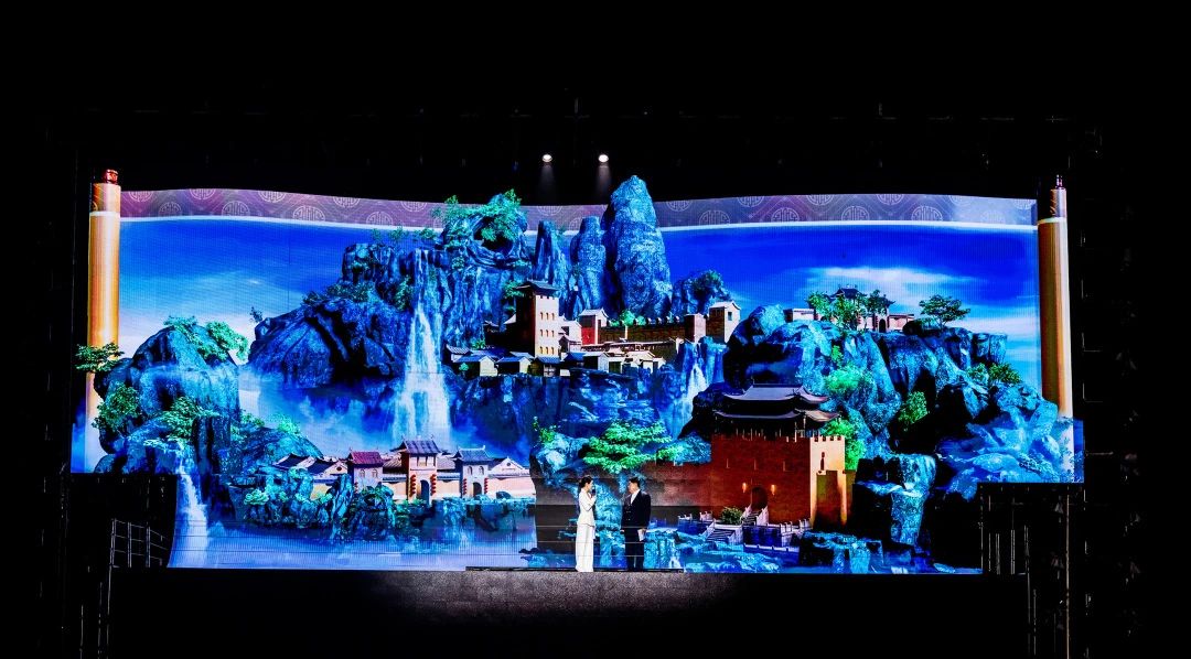 开幕式突破传统舞台演绎模式,启用巨幅画卷(LED屏幕)和天幕投影的组合表演,运用光影水舞配合戏剧、舞蹈以及影像画面,增强舞台的纵深感、氛围感、科技感,塑造立体空间,将多种表演元素糅合,为舞台增添更为丰富细腻的质感。