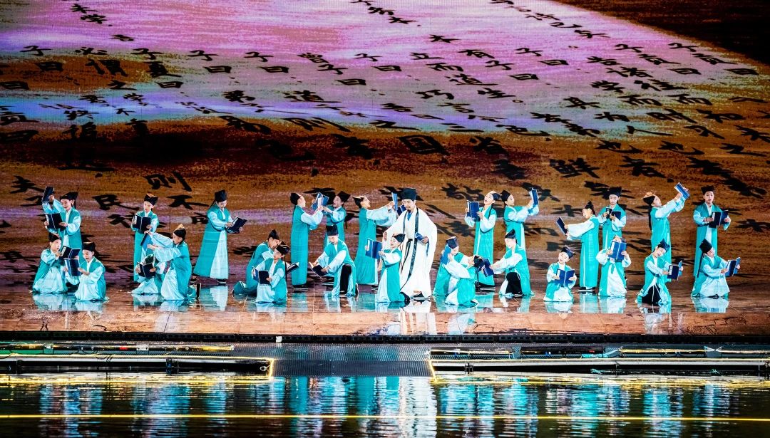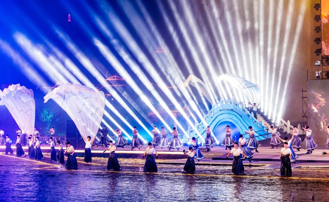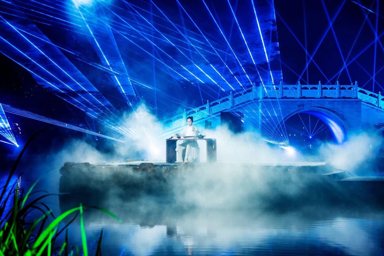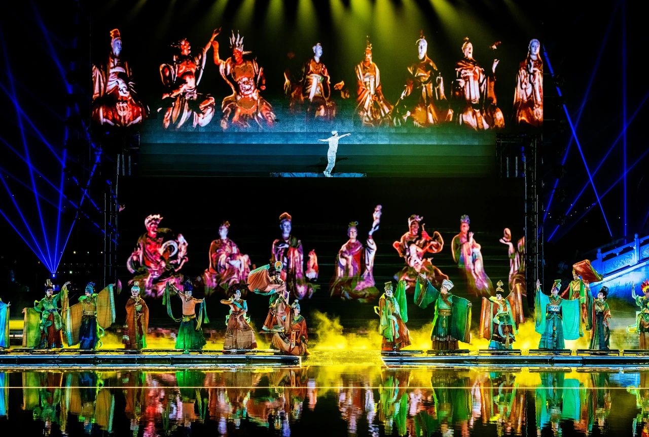 开幕式突破传统舞台演绎模式,启用巨幅画卷(LED屏幕)和天幕投影的组合表演,运用光影水舞配合戏剧、舞蹈以及影像画面,增强舞台的纵深感、氛围感、科技感,塑造立体空间,将多种表演元素糅合,为舞台增添更为丰富细腻的质感。