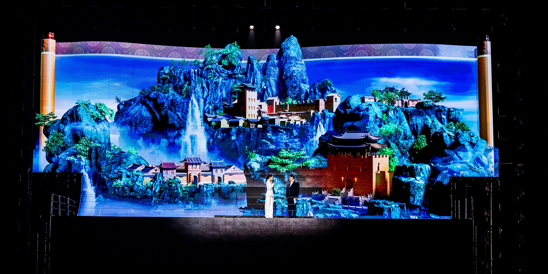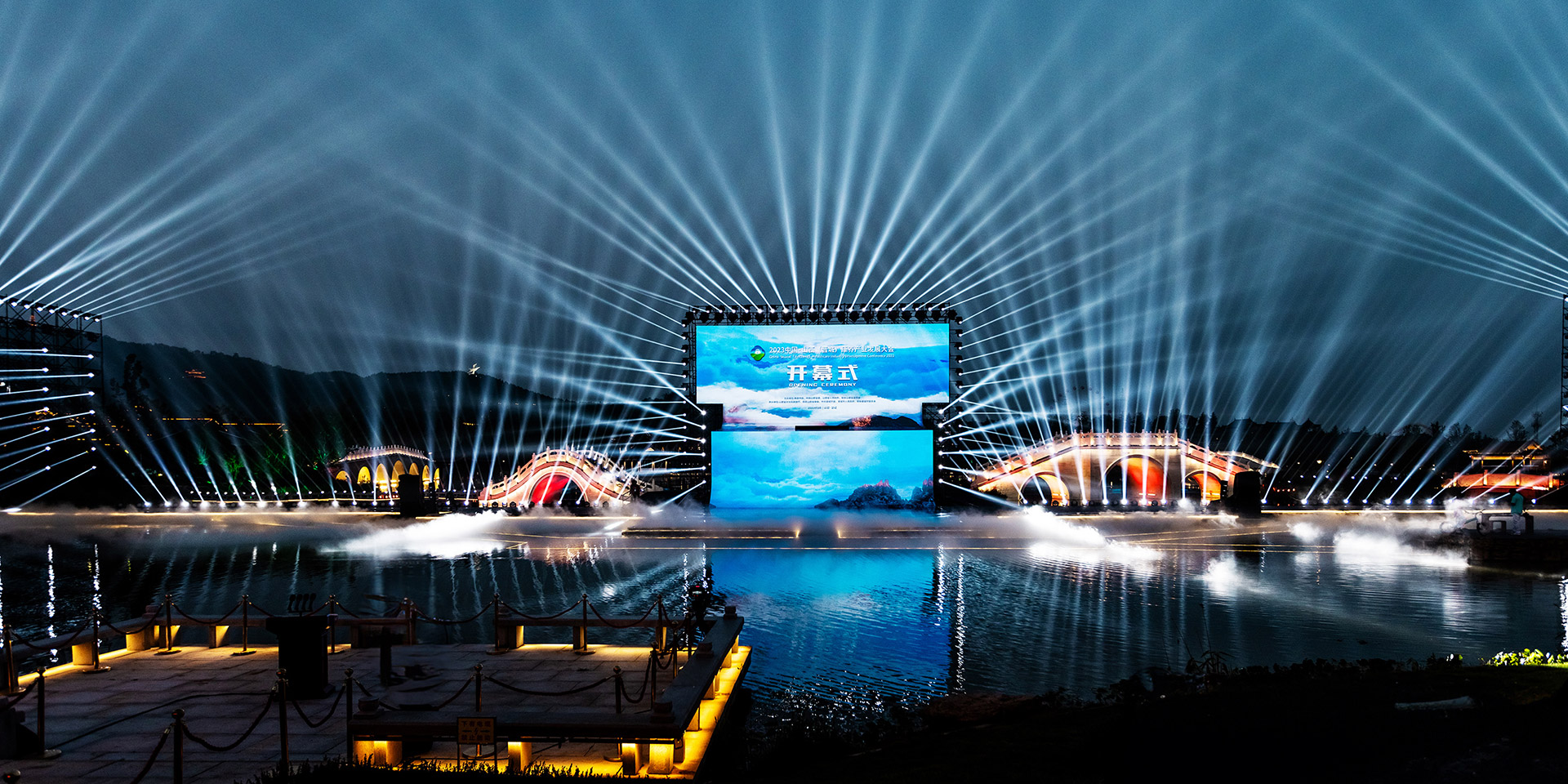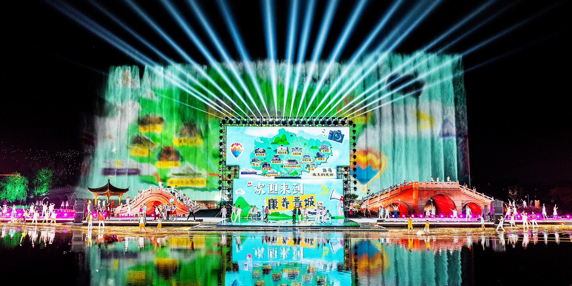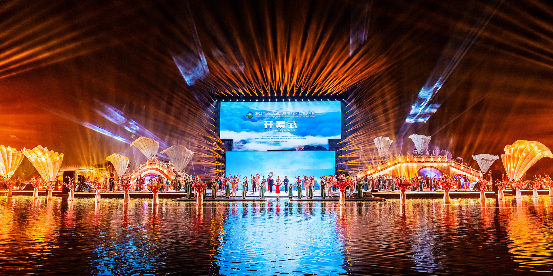 中国·山西康养发展大会开幕式突破传统舞台演绎模式,启用巨幅画卷(LED屏幕)和天幕投影的组合表演,运用光影水舞配合戏剧、舞蹈以及影像画面,增强舞台的纵深感、氛围感、科技感,塑造立体空间,将多种表演元素糅合,为舞台增添更为丰富细腻的质感。通过音舞诗画秀《云锦太行》、人文情境秀《书院有声》、歌舞秀《古堡是我家》、光影水舞秀《夏季》、国宝活化秀《二十八星宿》、时尚音乐剧《欢聚晋城》多维度动态呈现出晋城历史画卷、时代画卷和未来画卷。